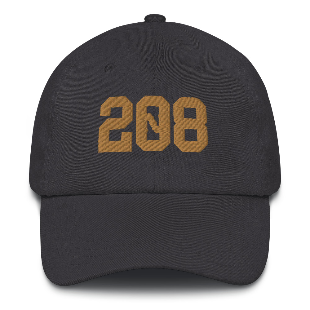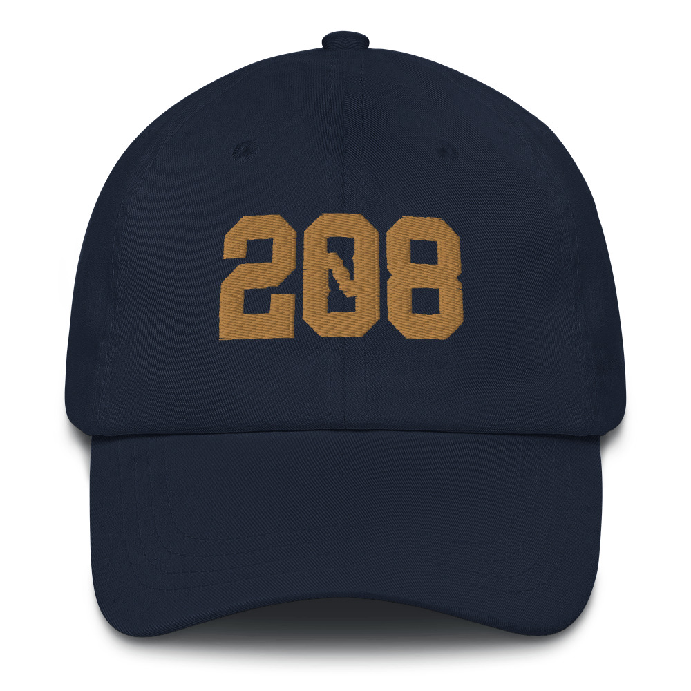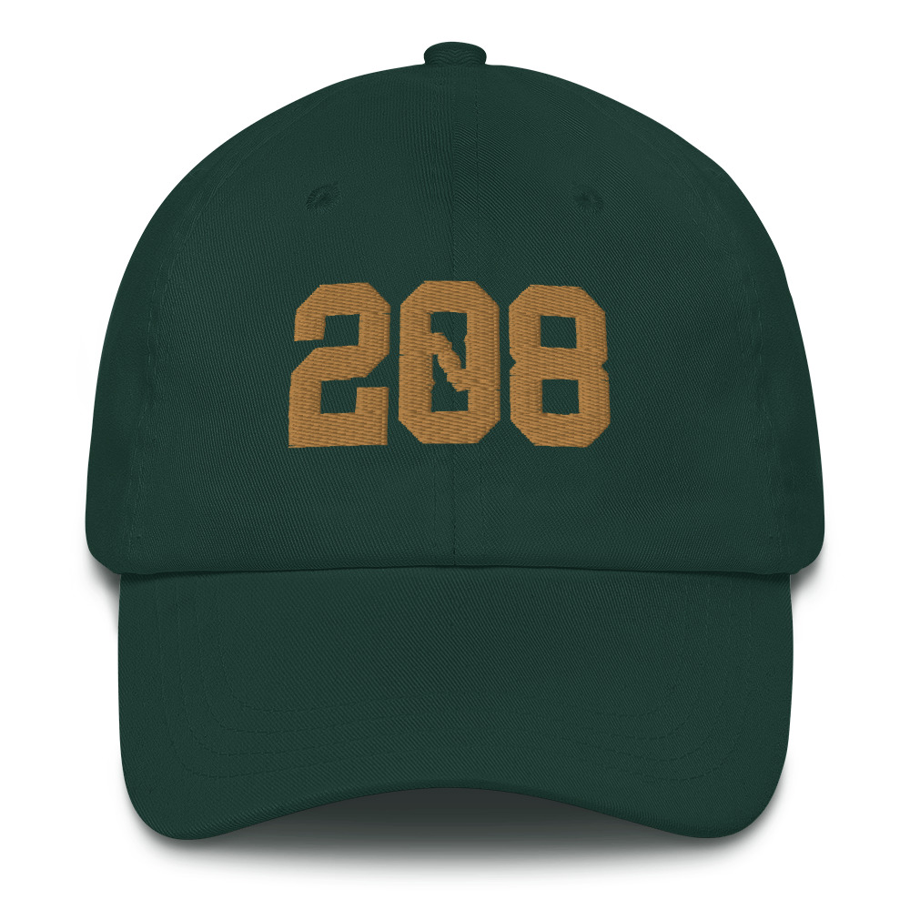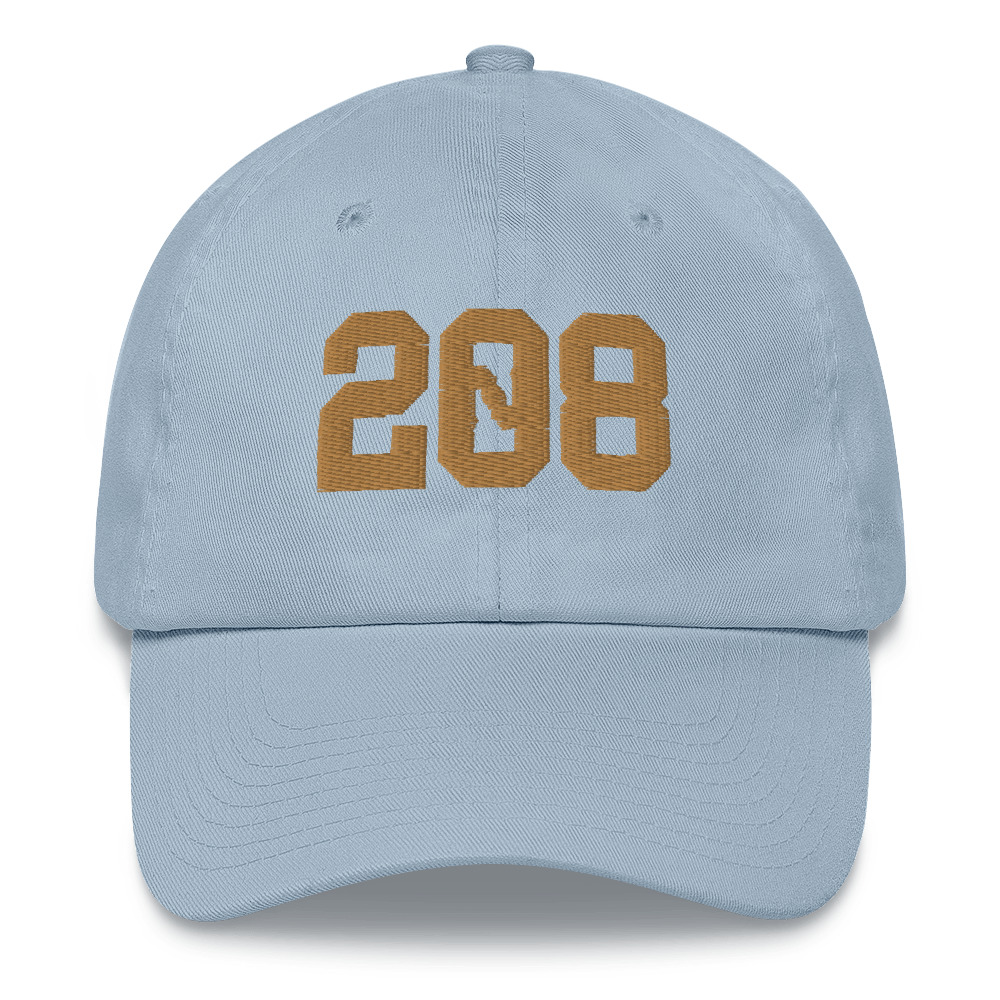 The 208 Idaho design embroidered on an unstructured dad hat with a curved bill.