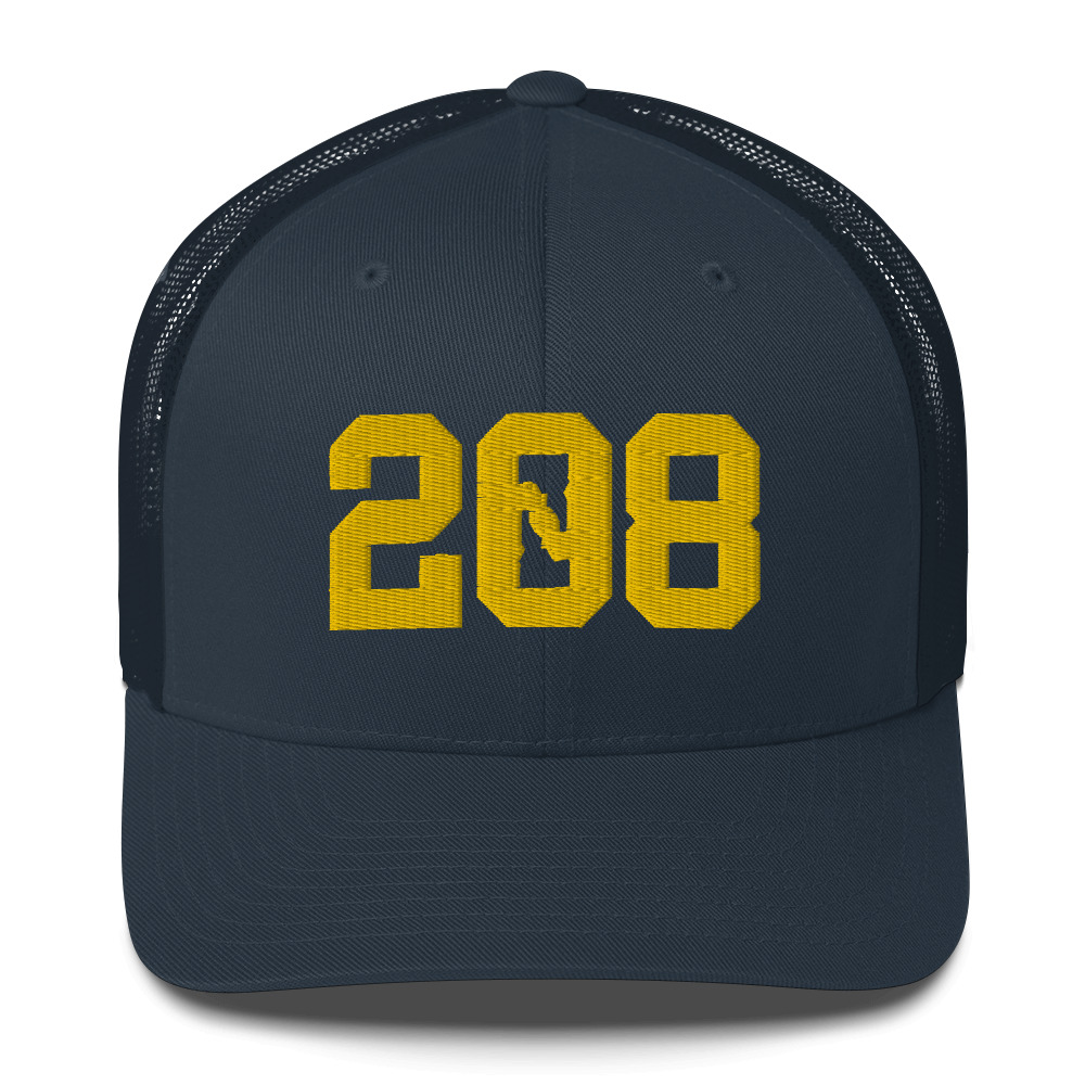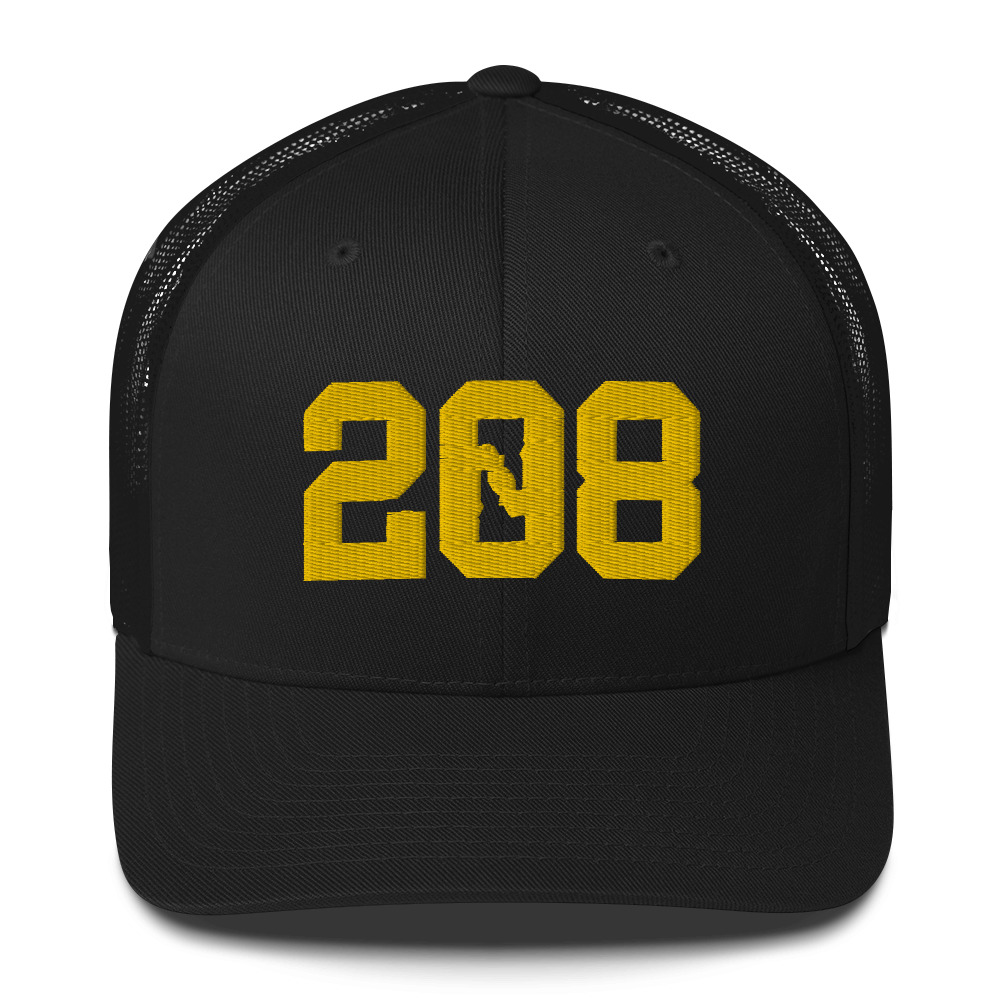The 208 Idaho Design embroidered on a six-panel trucker cap with a mesh back.