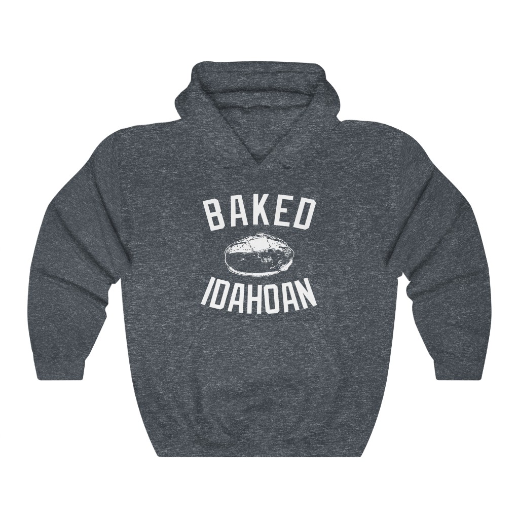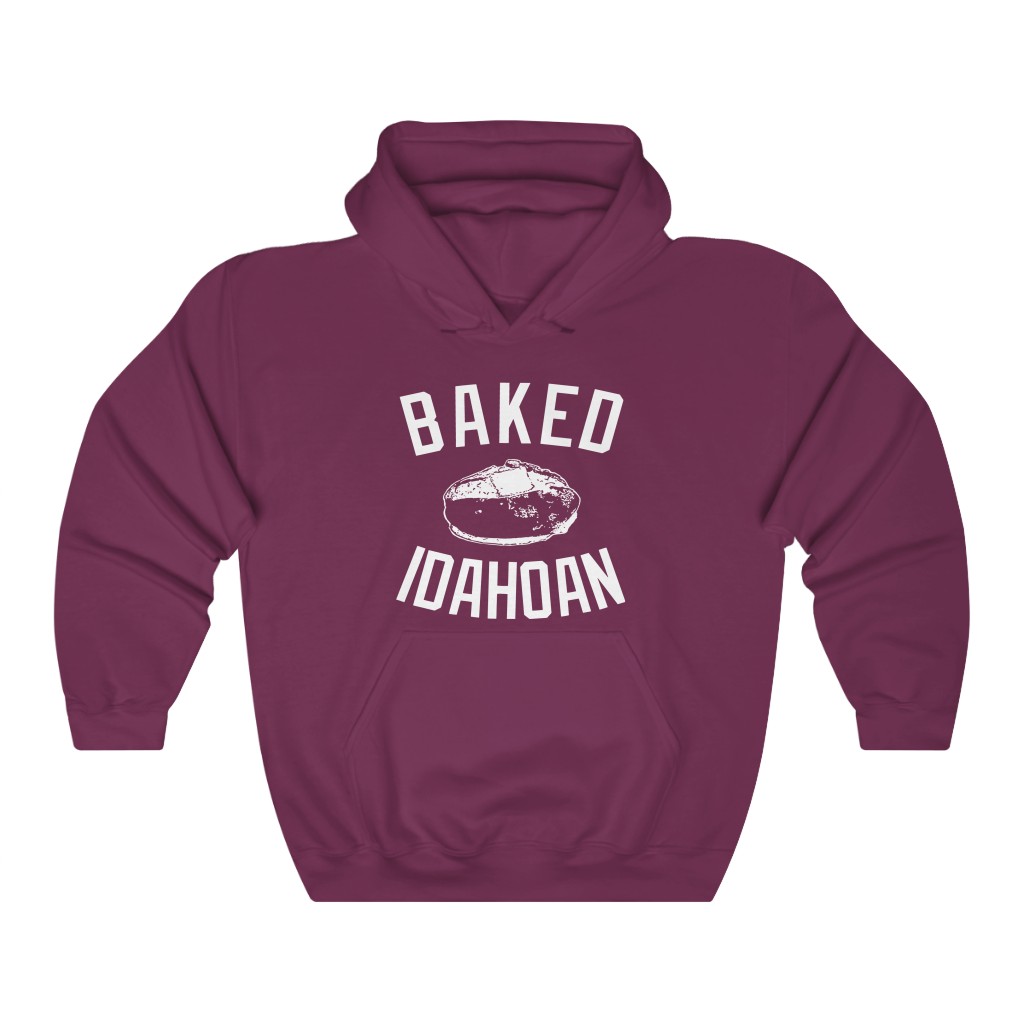 The Baked Idahoan design printed on a relaxed, classic fit 50/50 cotton/poly blend hooded sweatshirt.  This men’s (unisex) fit sweatshirt has a drawstring and front pouch pocket.  A staple of laidback comfort with a perfect medium weight fabric.