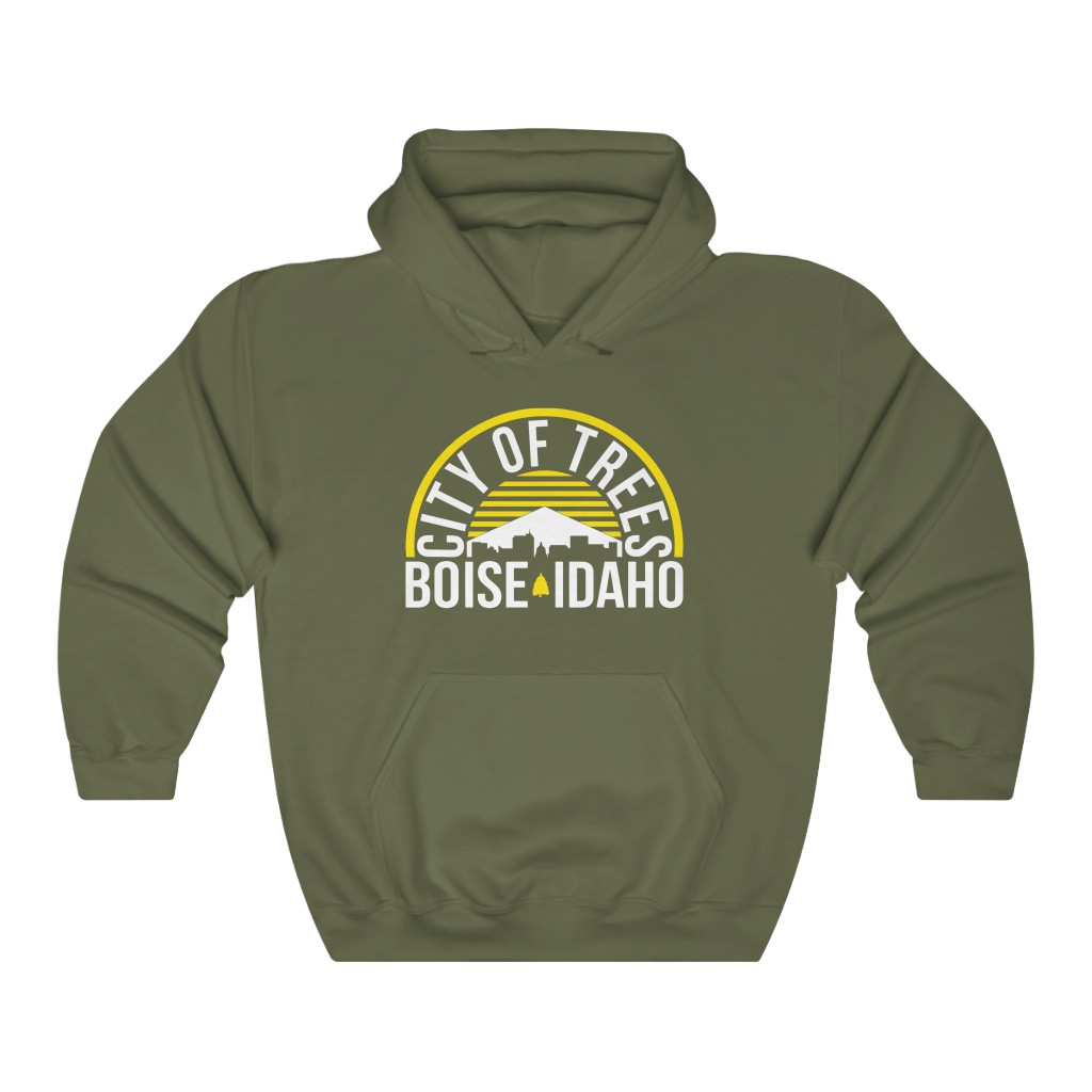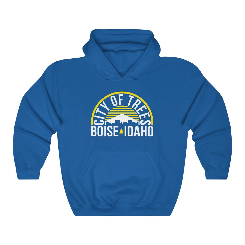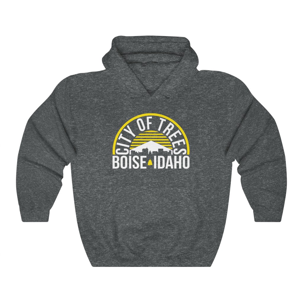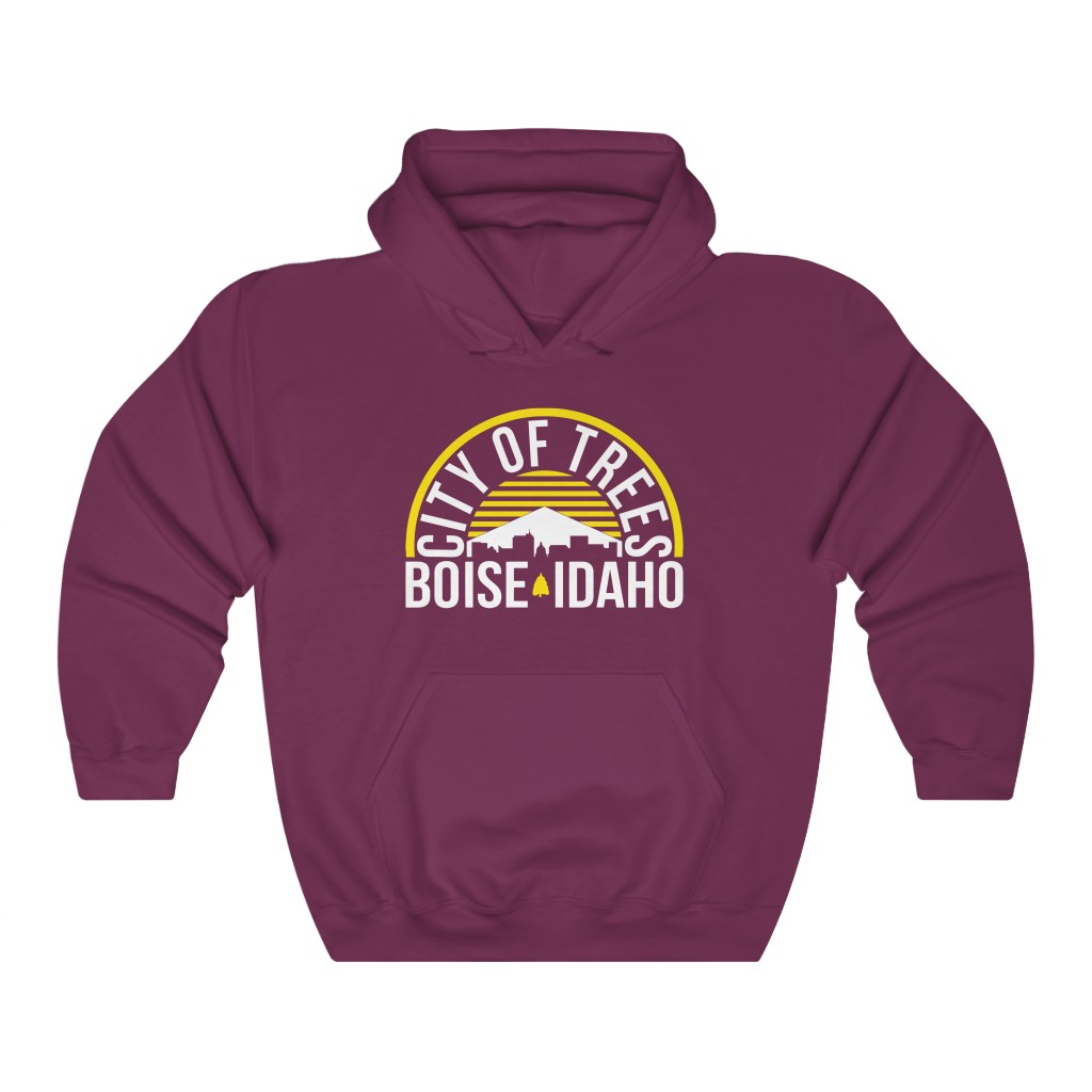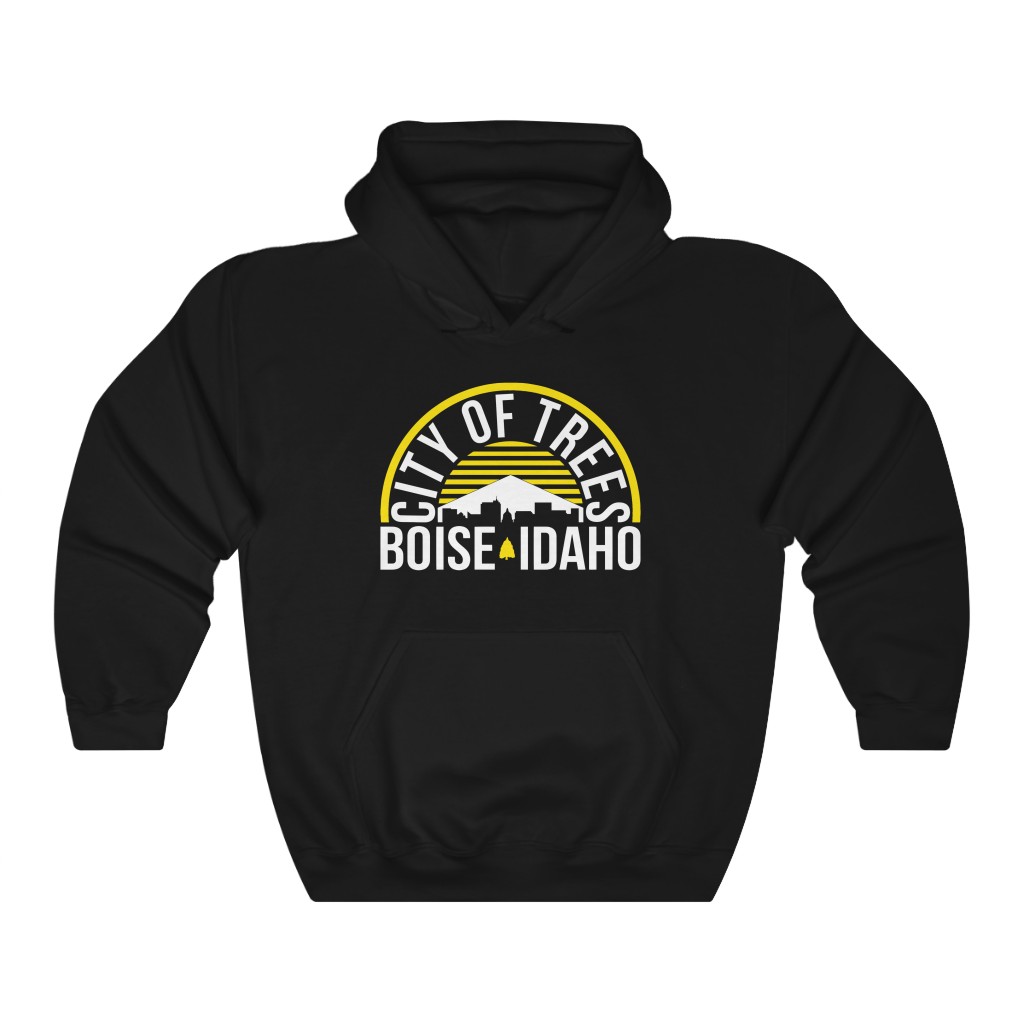 The Boise Arch Skyline design printed on a relaxed, classic fit 50/50 cotton/poly blend hooded sweatshirt. This men’s (unisex) fit sweatshirt has a drawstring and front pouch pocket. A staple of laidback comfort with a perfect medium weight fabric.
