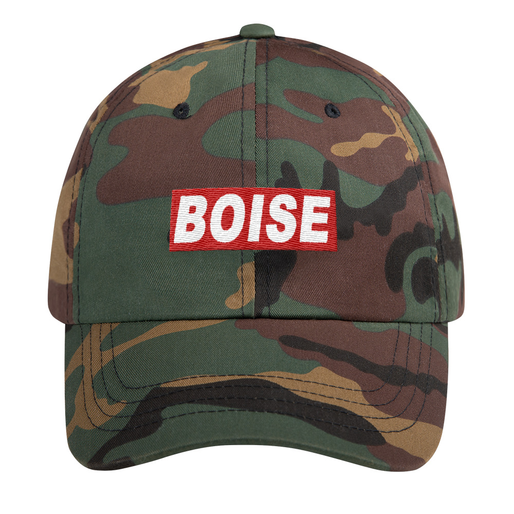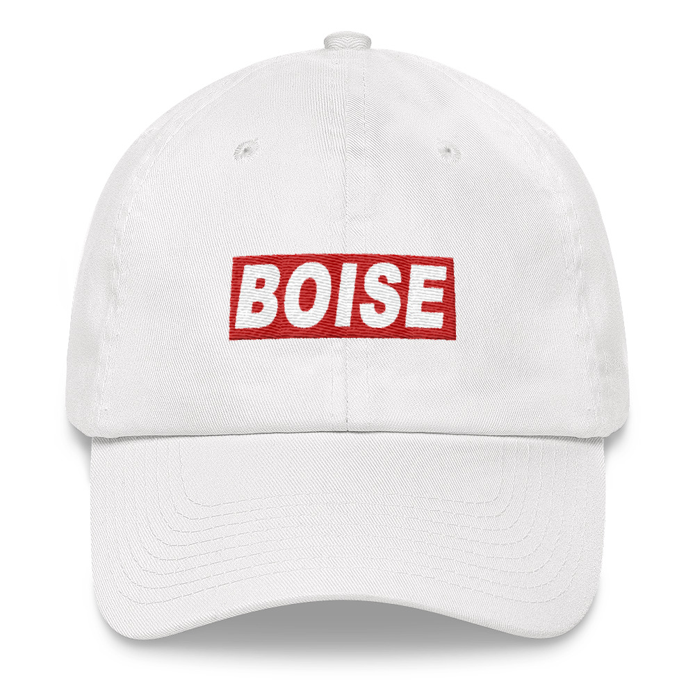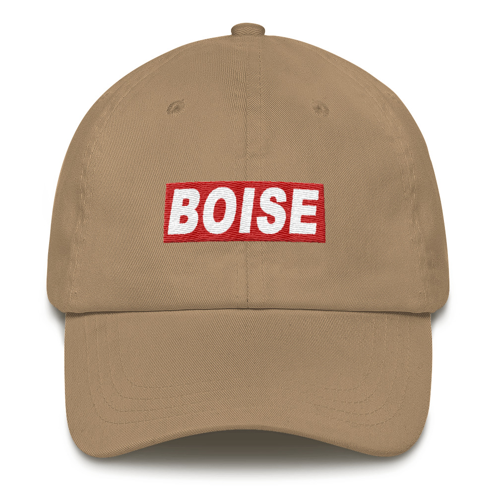 The original Boise Idaho Block Text design is embroidered on a low profile floppy dad hat with an adjustable strap and curved visor.